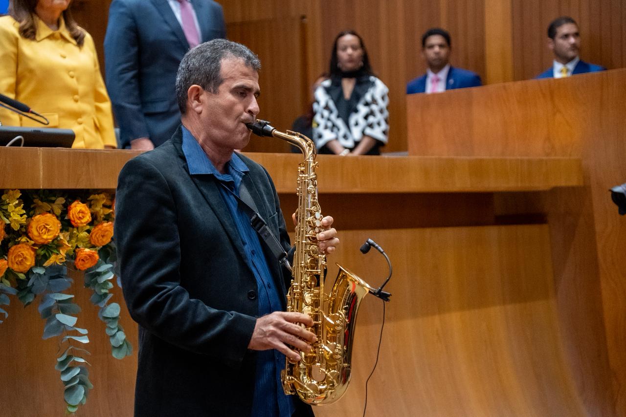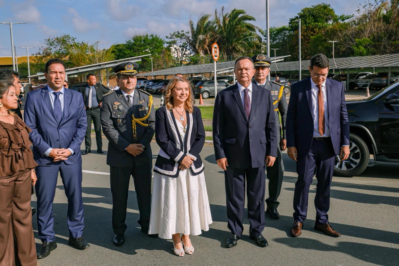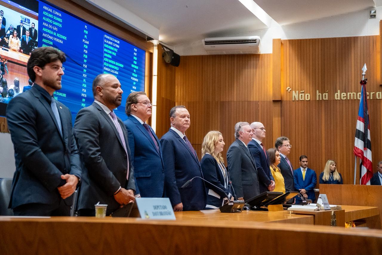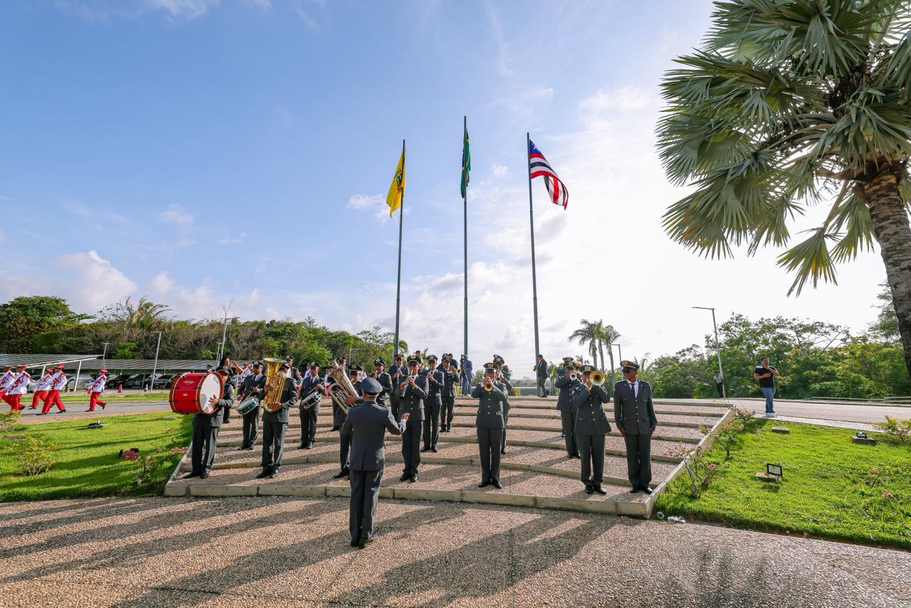 Na sequência, foram executados o Hino à Bandeira, o Hino de São Luís e o Hino do Maranhão, interpretados pela Banda da Academia Militar Gonçalves Dias, da Polícia Militar, na área externa da Alema. Após o momento cívico, a presidente Iracema Vale e o governador Carlos Brandão foram recepcionados sob escolta da Cavalaria Militar.